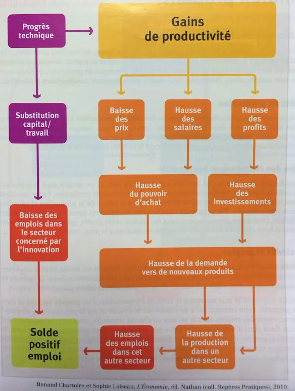 En effet, même si le progrès technique conduit à une substitution du capital au travail dans les secteurs primaires et secondaires, ce-dernier permet aux entreprises de réaliser des gains de productivité. Ceux-ci ont pour conséquence une baisse globale des prix des produits, ainsi qu'une hausse des salaires, ce qui conduit automatiquement à une augmentation du pouvoir d'achat. En parallèle, les entreprises réalisent plus de profits, ce qui les conduit à investir davantage.