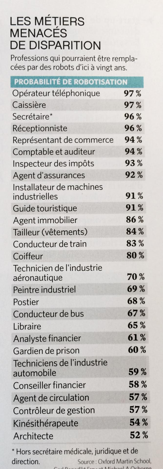 Ci-contre : estimations de la probabilité de robotisation des différents métiers d'ici une vingtaine d'années.