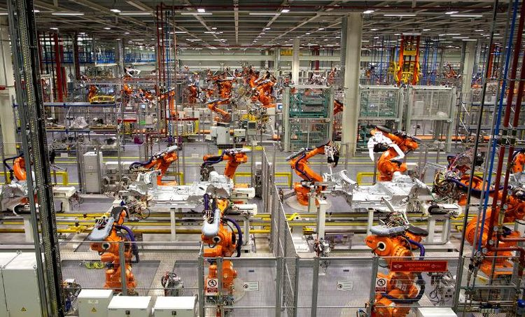 Ci-contre : photographie montrant une chaîne de production entièrement robotisée.