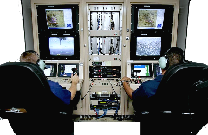 Ci-contre : cabine de pilotage de drone au Nevada (USAAF)