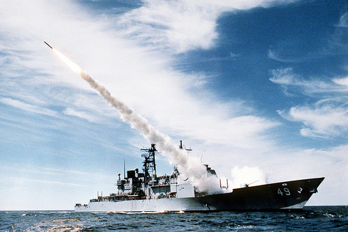 Ci-contre : le croiseur USS Vincennes tirant un missile surface-air (essai)